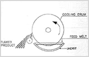 Material Fed in the form of melt is applied as a thin film over the rotating metal cylinder. Cylinder is internally cooled. The melt is solidified to a solid layer on cylinder. Layer is scraped out as flakes.